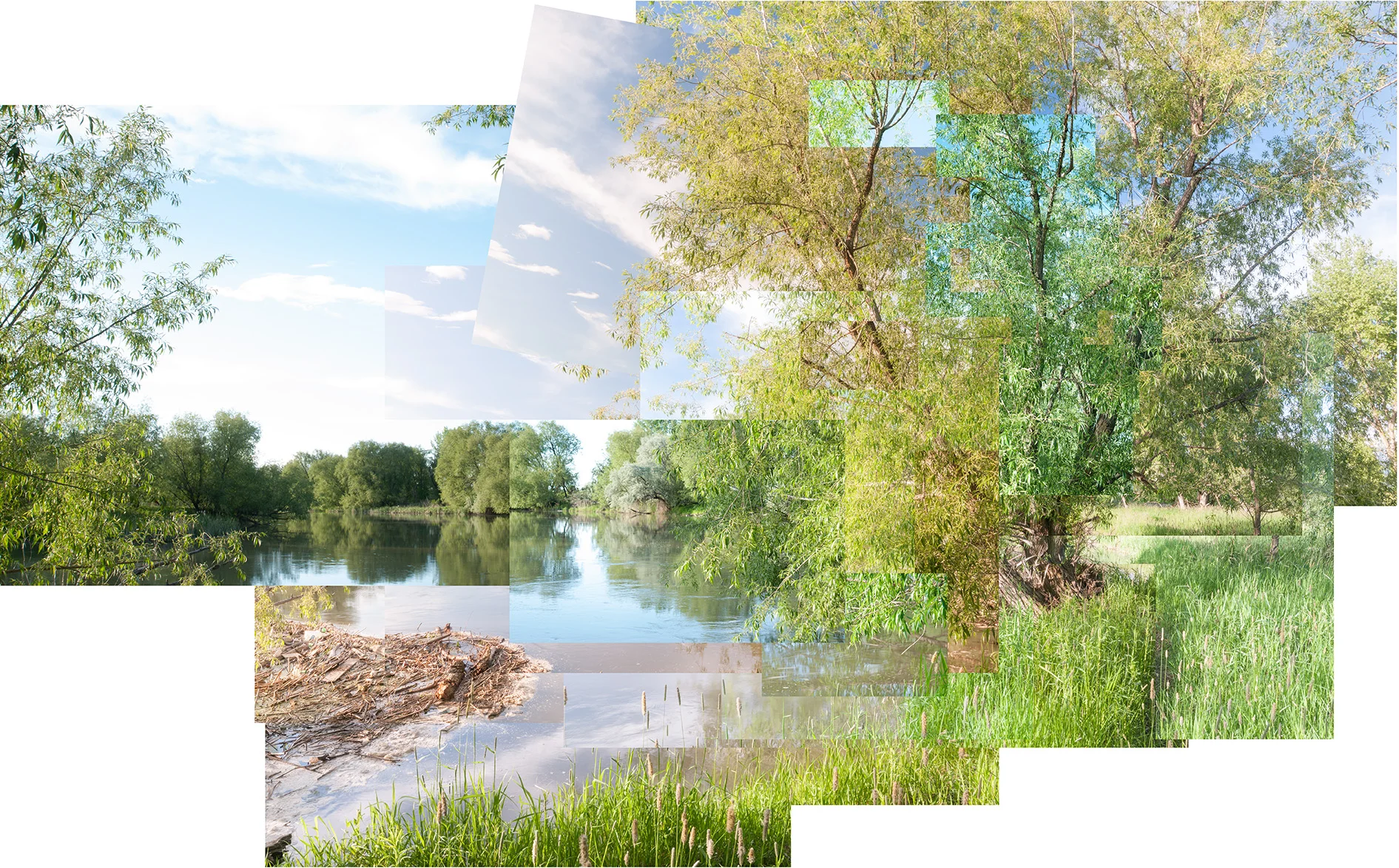 Which brings me back around to the photography of Krista Wortendyke, and the chord that was struck. In the blog post I did on her work, I explained (actually, I quoted her artist statement) that her photographs are composed of multi-frame images taken from video games, and photographs found on the internet to make a composite image that blurs the line between what is real, and what is fiction. Upon seeing that photograph in the email newsletter, I knew I had a direction I could take in a project on the Bear River. By making each photograph up of a composite of many photographs, I can show the passage of time in each individual photograph that makes up the whole, as well as the passage of time measured in days, weeks, months or even years, showing the effects of time and changes of seasons of a scene in a single photograph. Any changes in water levels of rivers and streams, the sprouting and death of leaves on trees, and any changes that Man might make on the landscape could all be observed in one image. That email arrived in my inbox at about nine a.m., and I wasn’t able to sit still or concentrate for the rest of the day. My mind was exploding with new ideas and locations to photograph and methods of display. In that post, I explained it wasn’t the first time I’d seen work done the way Krista created her photographs, and that I was familiar with James Balog. Even before I knew of Balog, Tyler Hopkins, a friend from college was doing mosaic-, multi-frame photographs. And since I came across Krista’s work, I’ve discovered a few more photographers working in this similar vein, such as Jake Weigel.