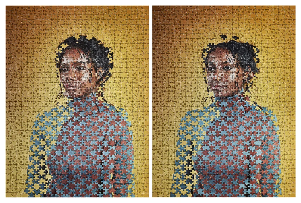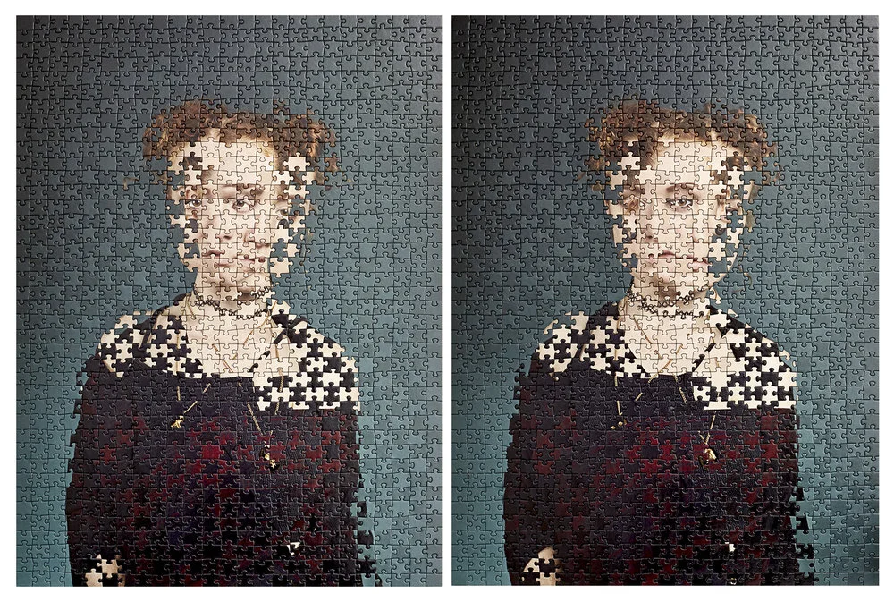 “Alma photographed sets of identical twins and made them into identical jigsaw puzzles. She then swaps every other piece of their puzzles, completely mixing them half and half. Not always knowing where their eyes, mouths and lips would end up, the result is a pair of eerie, unrecognizable portraits. No longer seen as completely identical, they are unique.”