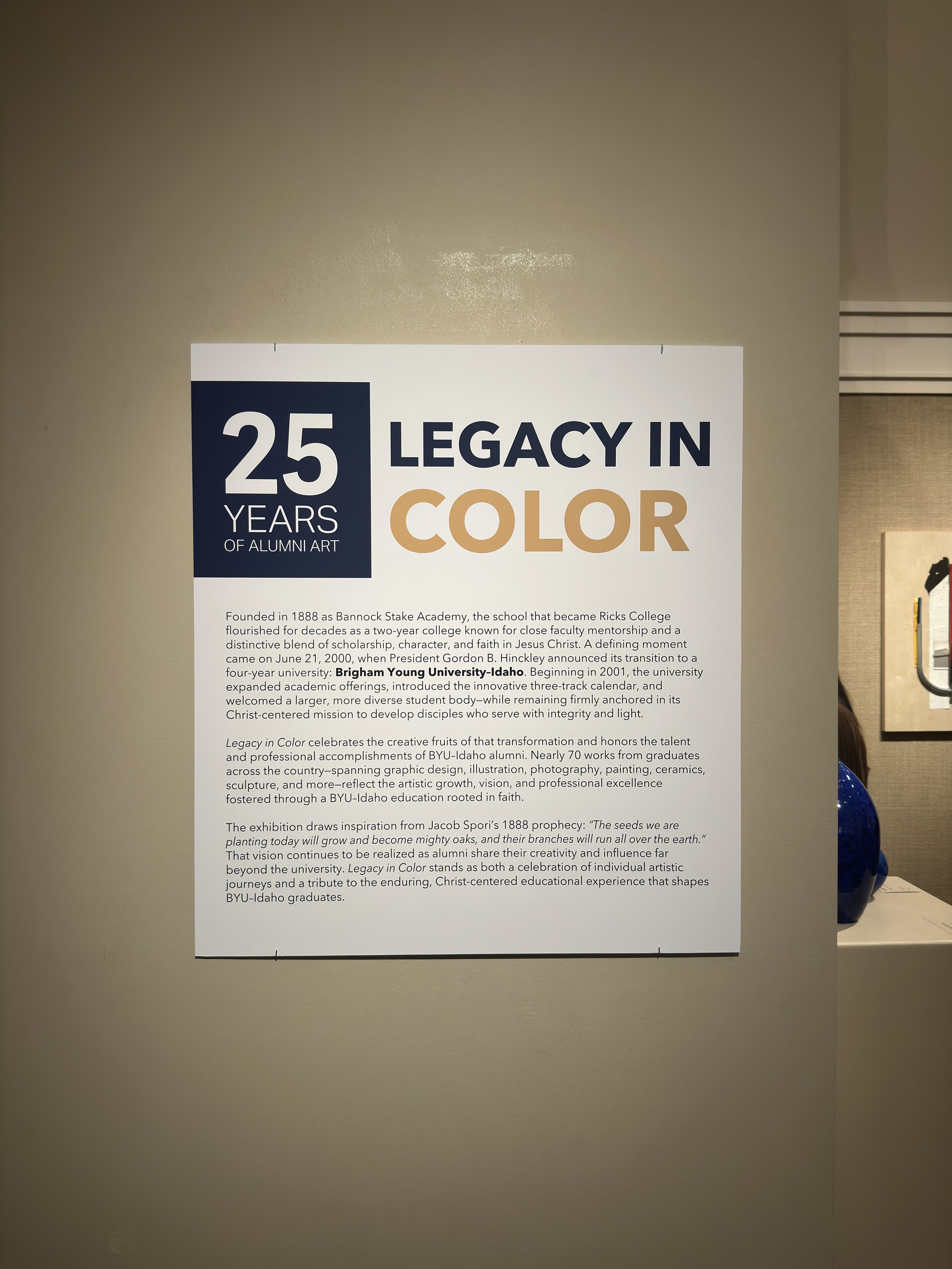 But the most meaningful one, which I alluded to at the opening of this post, happened just very recently. Nearly a year ago I was told by my former professor at BYU Idaho that there was going to be a 25th anniversary alumni exhibit taking place this year, titled Legacy in Color, 25 Year Exhibit, and in February I received an email from the curator of the Spori Art Gallery with the official announcement and invitation to submit work for consideration. Over the next few months I got work ready, and photographed and submitted, and the show’s reception finally opened September 25, a Thursday. We all made a little vacation out of the weekend so we could attend the reception, and I looked forward to that event much the same way a child anticipates Christmas. The week before the show opened, the curator asked if I would be interested in being interviewed by the university’s radio host, and of course I accepted. I was interviewed the week of the exhibit and that interview can be heard here.